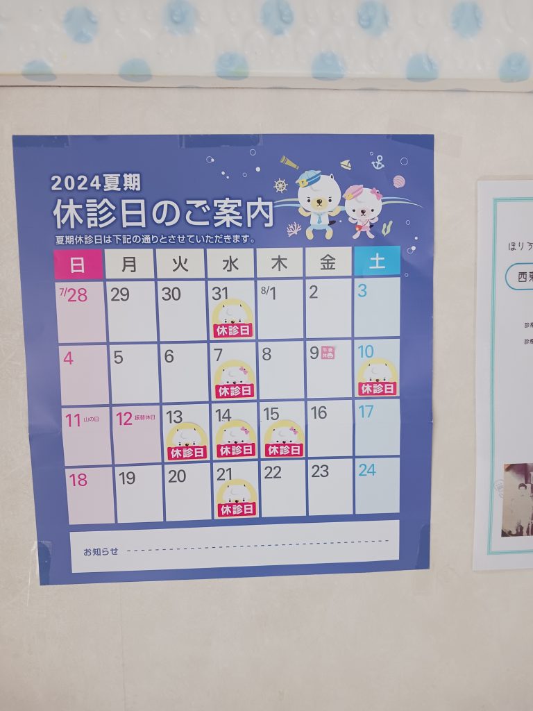 毎日暑い日が続いていますね。ほりうち歯科医院は下記日程にて休診日とさせていただきます。皆様にはご迷惑をお掛け致しますが、どうぞご理解いただけますようお願い申し上げます。